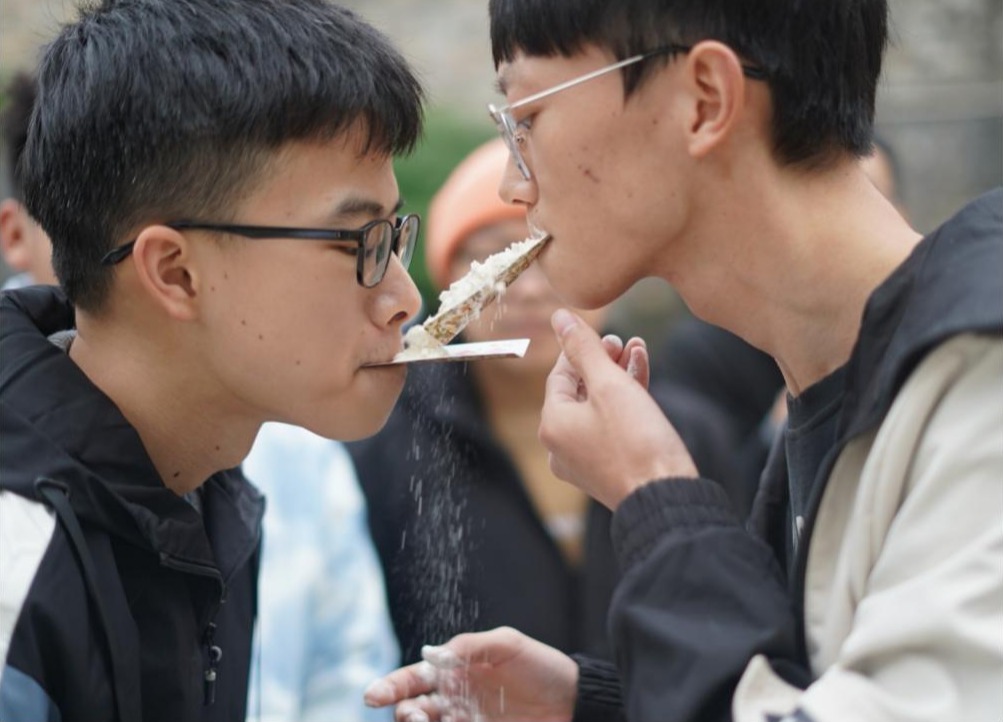 活动中,同学们积极参与,在“比划我猜”游戏环节中,各小组队员们脑洞大开,用奇妙的肢体语言成功让队友猜出一个又一个词语;在考验体力和算数能力的“折返跑”环节中,彰显着同学们的青春活力;在压轴游戏“传面粉”中,各小组斗智斗勇,队员间默契配合,充分调动同学们的情绪,将现场气氛推向高潮。