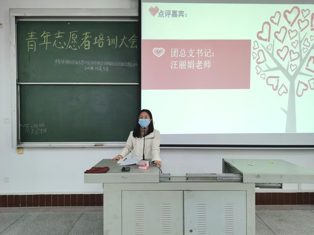 时间:2021-11-04 编辑:学生科 点击:本网讯(通讯员:胡进怡 摄影:詹佳莉)11月3日,我院于6401教室举行2021年秋季外国语学院青年志愿者培训大会,出席本次大会的嘉宾有外国语学院团总支书记汪丽娟、团总支副书记陈媛、沈明慧。