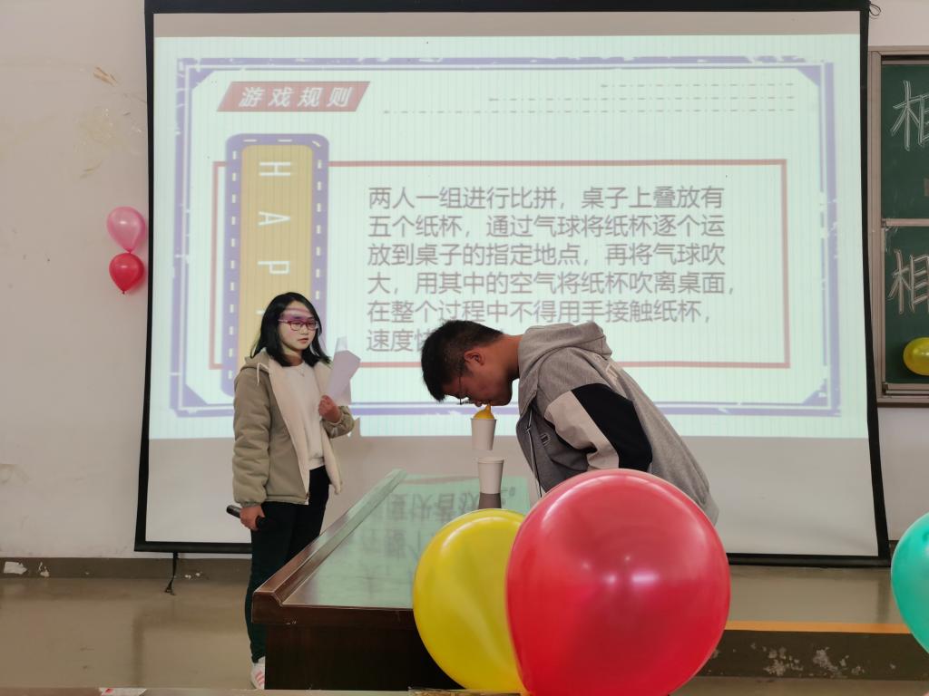 活动分为才艺表演以及小游戏两大方面。活动伊始,由信息工程学院的何本凡以一首《最长的电影》带动全场,然后由小游戏——“答非所问”进入游戏环节,参赛者们围成一圈,用一个与问题毫不相关的答案来回答问题,既考验脑力也考验速度,增进了参赛人员相互之间的交流,营造了浓厚的活动氛围。紧接由我院李兴林带来《浪漫主义》,场下观众伴随着歌曲的节奏挥舞着手臂。第二个游戏名为“孰周瑜孰黄盖”,游戏以两人一组,由石头剪刀布决定攻方与守方,回合制游戏,输的一方以才艺展示作为小惩罚。最后一个游戏是“蓄能冲杯”,游戏两人一组进行比拼,通过气球将纸杯来回运送,且在整个过程中不得用手接触纸杯,速度快者获胜,此时全场欢腾,现场气氛达到最高点。最后由主持人致辞宣布活动结束。