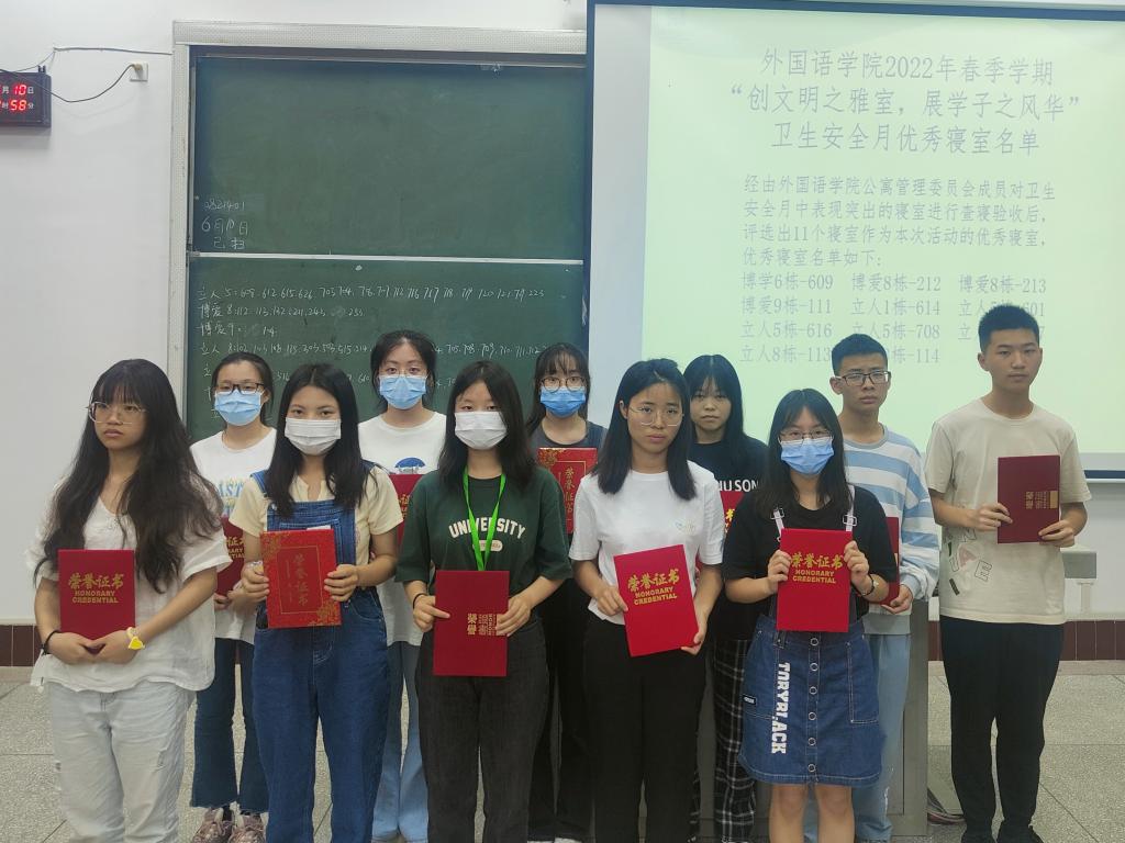 活动最后,学生科老师陈小双为11个优秀寝室颁发证书,给予表彰与鼓励,并合影留念。