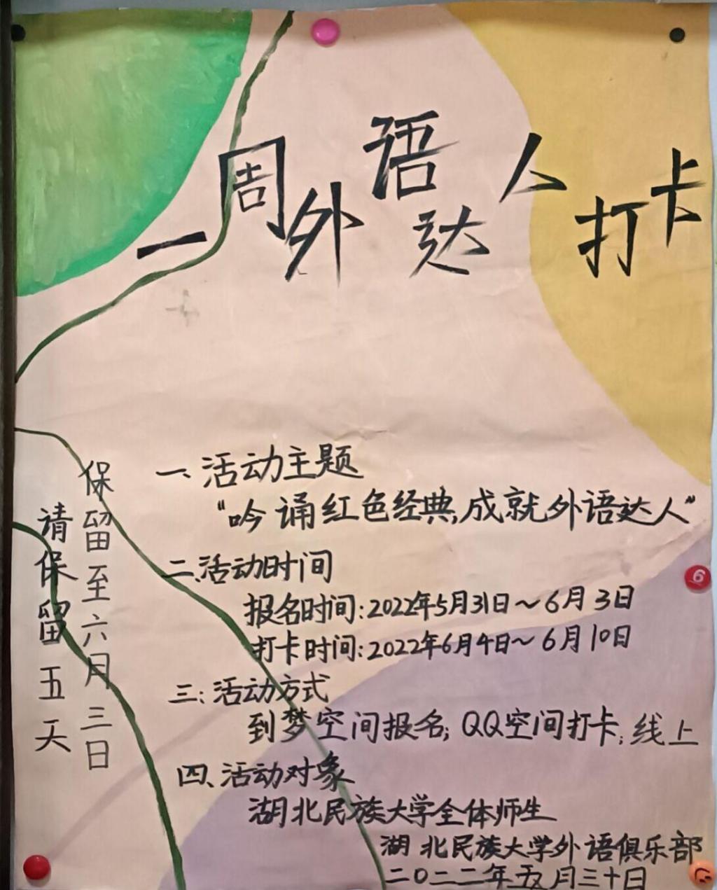 本网讯(记者 李春艳 闵润柳)为丰富大学生的课外生活,学习先进红色文化,提高大学生的外语水平。yL23411永利官网登录外语俱乐部于 2022年6月4日至6月10日线上举办以“吟诵红色经典,成就外语达人”为主题的外语达人打卡活动。此次活动面向yL23411永利官网登录全体学生。
