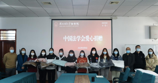本网讯(记者 周富鸿/文 王雅琪/图)近日,中国法学会向院法学专业学生捐赠100套羽绒服。3月9日,我院于9B314会议室举办中国法学会爱心捐赠仪式,我校校友办公室主任熊彪,我院党总支书记、院长汪燕出席仪式并为受捐学生代表发放爱心物资。