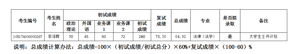基于学校招生计划的调整,现递补录取一名法律硕士(法学)大学生士兵计划考生: