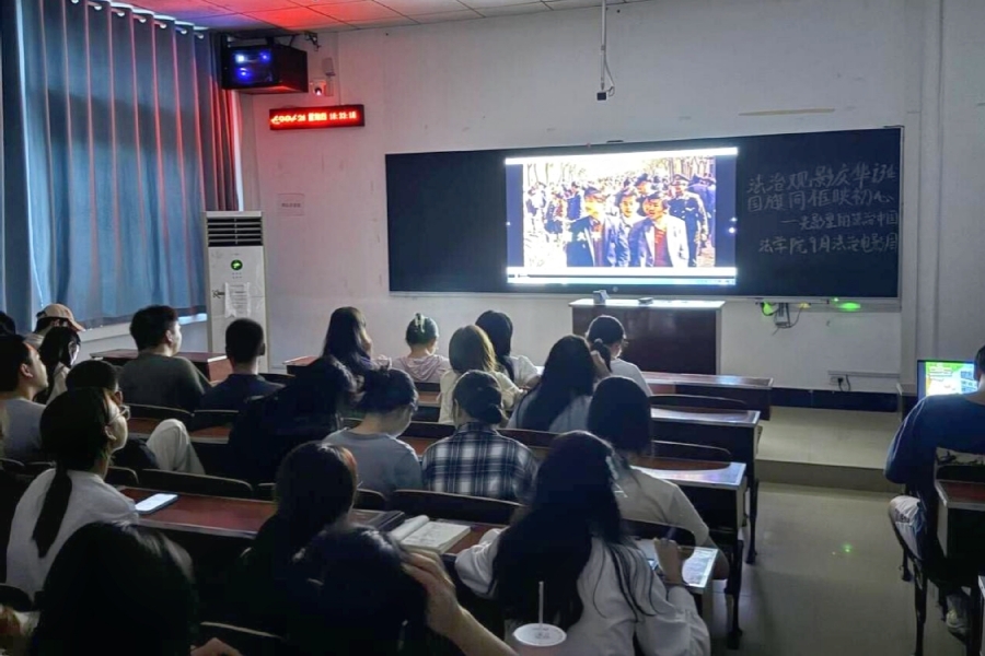 在“光影里的法治中国”活动现场,学生一同沉浸在经典法治电影《秋菊打官司》的世界里。观影结束后,学生交流观影心得,深入讨论“我们能为法治中国建设做些什么”“如何在新时代做一个爱国者”等问题,抒发作为法学青年的爱国情怀。