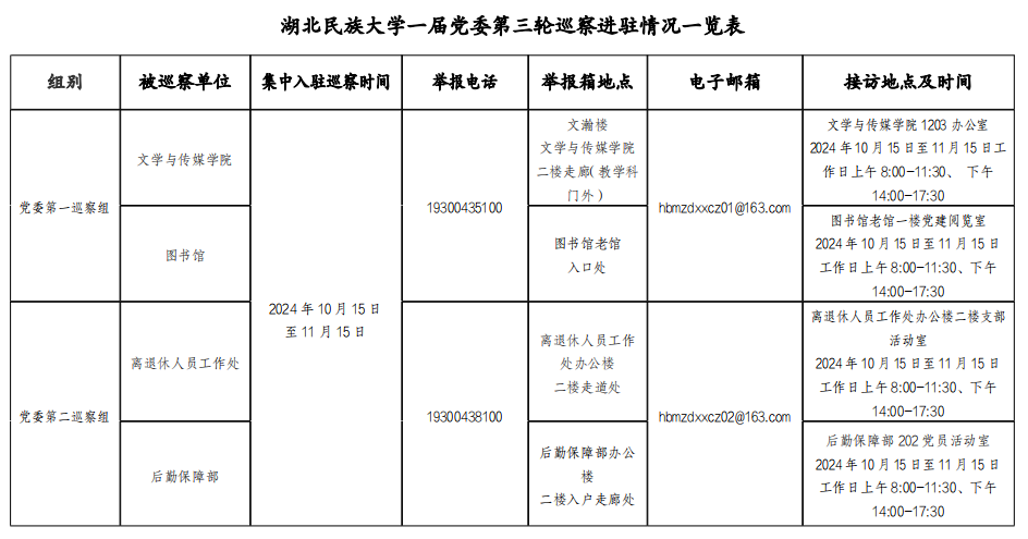 根据学校党委统一部署,截至10月17日,一届党委第三轮巡察完成正式进驻。两个巡察组采取“一拖二”的方式,将对文学与传媒学院、离退休人员工作处、后勤保障部、图书馆等4个院级单位开展常规巡察。