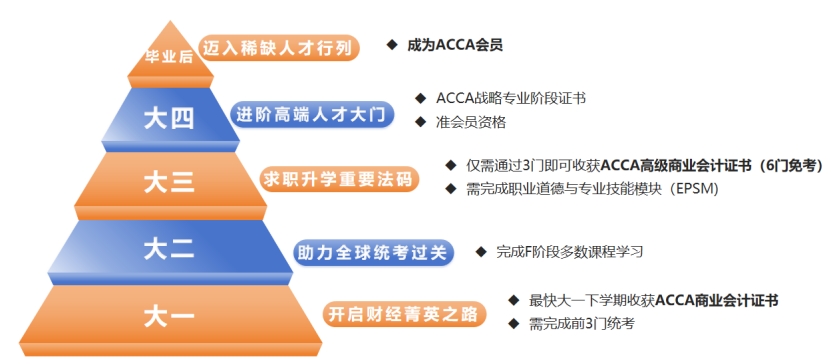 会计学ACCA方向班是我校唯一官方开设的会计学特色专业方向,隶属于经济与管理学院会计学专业,由学校统一招生和管理。经申请,会计学ACCA方向班最高可享受ACCA官方授予6门免考政策,本专业学生入学即可获得对应科目全球统考免考,仅需完成3门科目全球统考,最快大三下学期即可获得ACCA高级商业会计证书,收获未来求职、升学助力砝码,更快跻身ACCA准会员行列。
