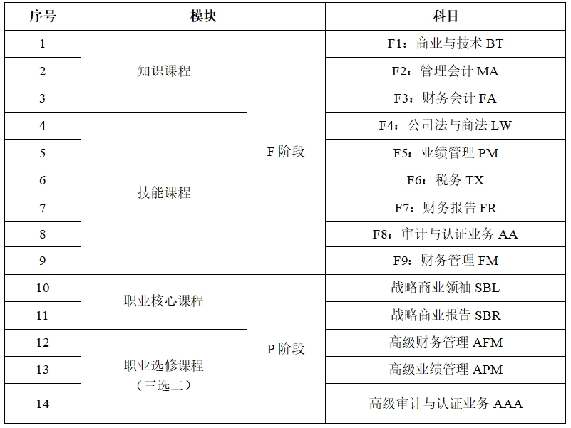 表 1 ACCA方向班核心课程设置表