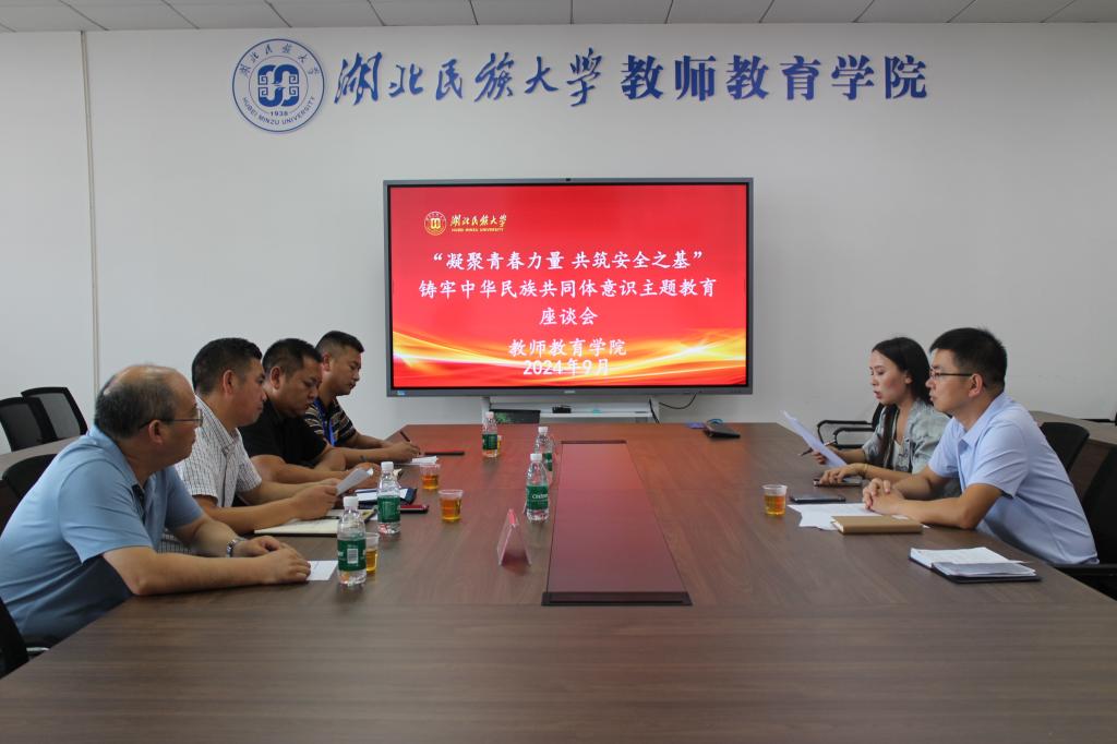 本网讯(通讯员 胡聪颖)9月19日下午,学院在9A505会议室举办了 “凝聚青春力量 共筑安全之基”铸牢中华民族共同体意识座谈会。yL23411永利官网登录学生工作部副部长何永红、保卫处副处长李建华、学生工作部民族事务办公室主任谭学文、保卫处政保科科长徐拥军、教师教育学院学工办主任成润、辅导员尼沙、吾卜力参加了本次活动,会议由教师教育学院党总支副书记曹骞主持。