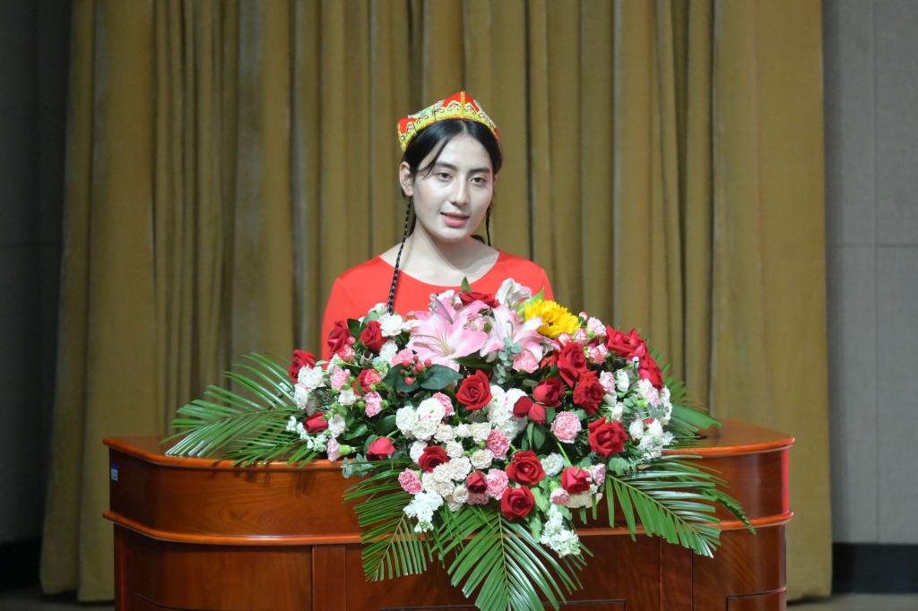 民族预科生伊丽米努尔作为2024级预科代表发言,来自新疆和田的她,跨越 3800多公里来到这里,心中充满了憧憬与期待,她深知预科学习是一个全新的挑战,也是一个成长与蜕变的机遇。不仅要学会学习,也要学会生活,学会与人相处,她将以开放的心态去接纳每一个人,用真诚和善良去编织友谊的纽带,用拼搏和实践去播种希望、挥洒汗水、收获成功。