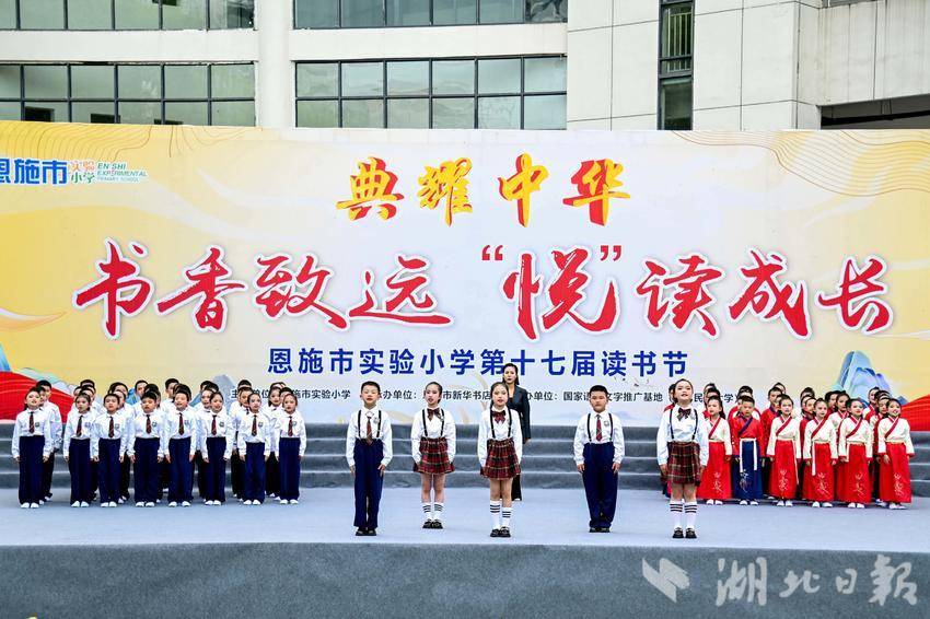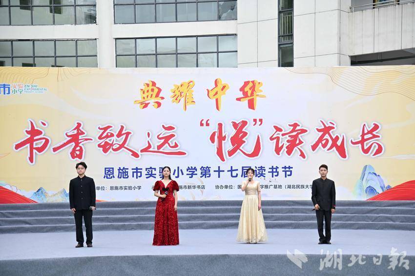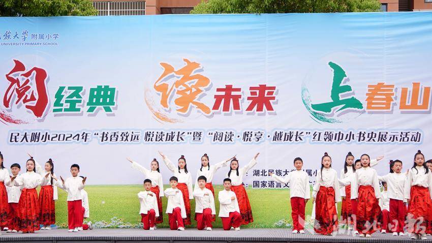 实验小学活动现场,学生头戴小黄帽、手持各色自制纸飞机随校歌音乐摇摆。情景歌舞《清江村居·诗漫春山》中,表演者身着土家族服饰用土家语歌唱诗书之美,现场书写毛笔字,呈现恩施州独特的山水诗意;读书分享《读经典、育新人》采用师生问答形式,教导学生多读书、读好书,在一问一答间淋漓展现“经典育人”理念;群口相声《比读书》通过说、学、逗、唱切磋学问,表演者身着中国红马面裙执笔起舞,展现欣欣向荣的阅读情景。我校语言艺术团成员朗诵《生活中英雄们的中间》,追忆抗美援朝英雄张卫良,通过情景再现形式演绎英雄事迹,呼吁学生敬畏英雄、珍惜当下、建设美好家园。