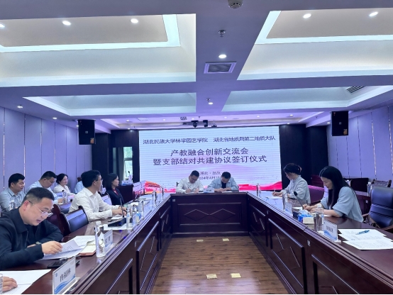 参观结束后,全体与会党员在湖北省地质局第二地质大队701会议室进行产教融合创新交流会暨支部结对共建协议签订仪式。四个支部秉承“互带互动、资源共享、共同发展、联建共赢”的理念,签订《党建共建协议书》。