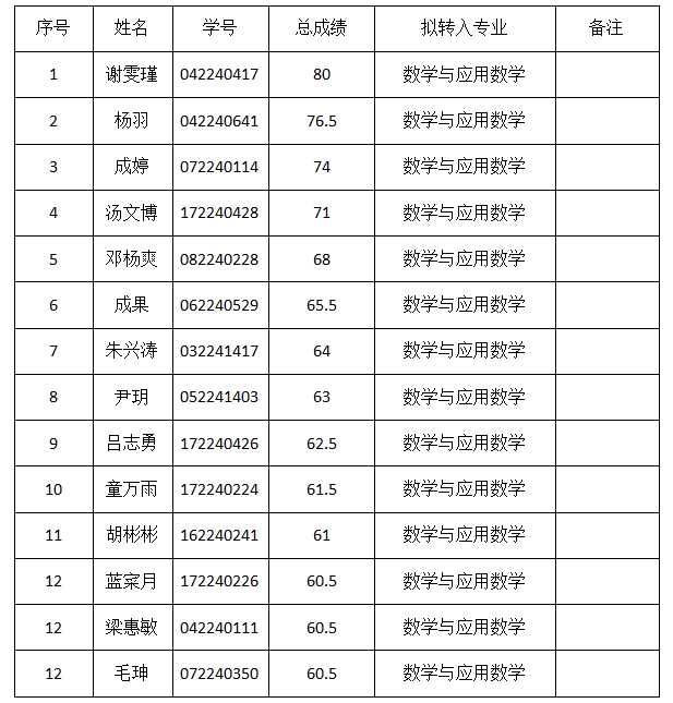 根据《yL23411永利官网登录2022级普通本科学生转专业工作方案》、《数学与统计学院2022级学生转专业工作实施细则》,数学与统计学院2022级普通本科学生转专业工作考试环节已完成。现对申请转入数学与统计学院的2022级学生成绩进行公示,公示时间:2023年2月17日—2023年2月20日。请全体师生对公示名单进行监督,如有异议,请在公示期内向数学与统计学院学生科反映。
