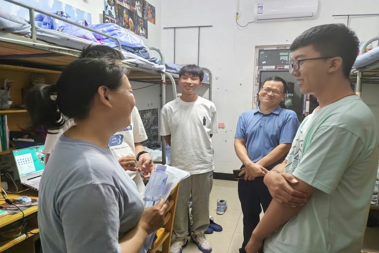 本网讯(记者 尚者/文 向桂林/摄)为帮助2023级新生尽快适应学校生活环境,9月9日晚,我院党总支书记赵魁轩、2023级新生班主任、学生科副科长黄丽娜、辅导员刘聪、廖祥宇以及学生党员和公寓管理委员会干部开展新生寝室走访活动。