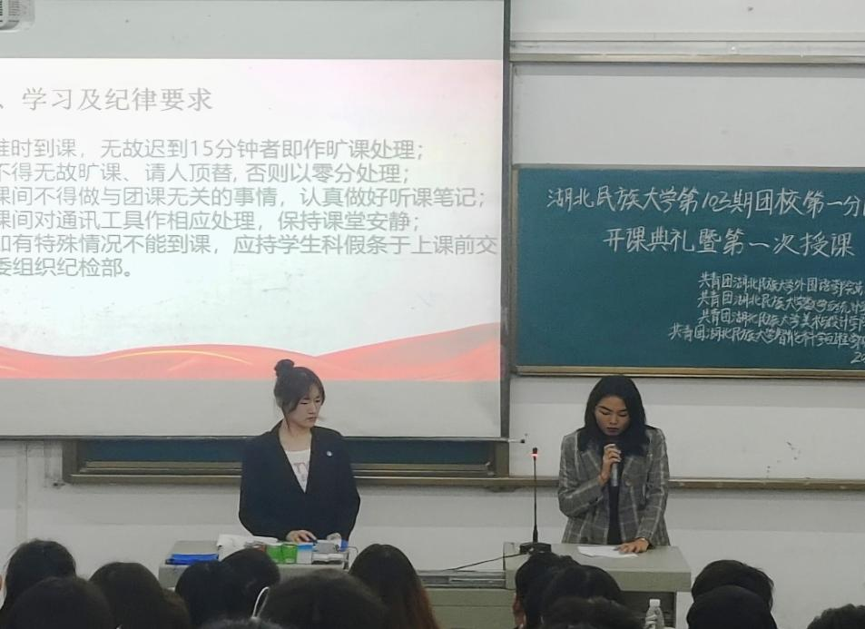 提升共青团员思想理论水平和政治素质,进一步增强广大学生的团员意识,加强团员队伍建设。yL23411永利官网登录第103期团校第一分团校开班仪式于2024年4月9日晚在数学与统计学院开展。数学与统计学院团总支书记刘聪,外国语学院团总支书记周婷出席本次开课典礼。数学与统计学院、外国语学院、美术与设计学院、智能科学与工程学院团校成员到场聆听。