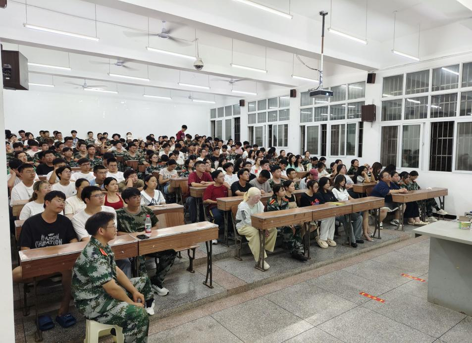 蔡立波以“心系国防,强国有我”为题,通过真实案例和详实数据,系统介绍我国国防建设的发展历程与重大成就,阐述新时代国防安全的深远意义。他强调,军训不仅是体能的锻炼,更是纪律作风的磨砺和家国情怀的培育,鼓励同学们增强国防观念,将个人理想融入国家发展,以实际行动为中华民族伟大复兴贡献青春力量。