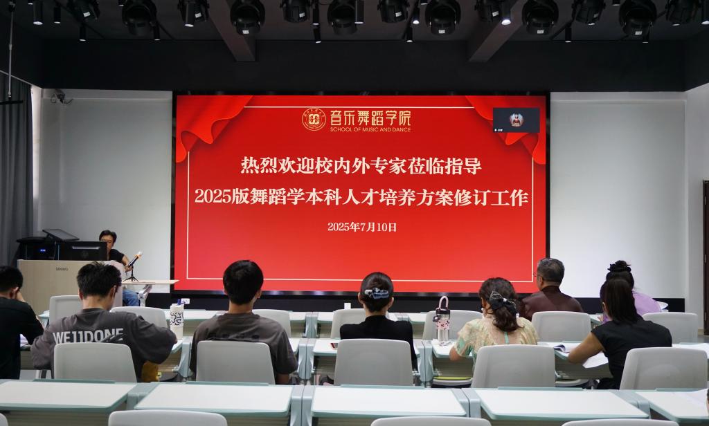 论证会由学院副院长王松主持。会议特邀多位国内舞蹈教育领域知名专家进行线上指导,包括北京舞蹈学院副院长邓佑玲教授、中央民族大学舞蹈学院院长姜铁红教授、湖南师范大学音乐学院王光辉教授以及华中师范大学音乐学院舞蹈系党支部书记兰天文副教授等。同时,学院舞蹈学专业全体教师及部分优秀毕业生代表杨覃、侯滔、熊辉、张含等在学院智慧教室现场参会,共同为人才培养方案把脉问诊。