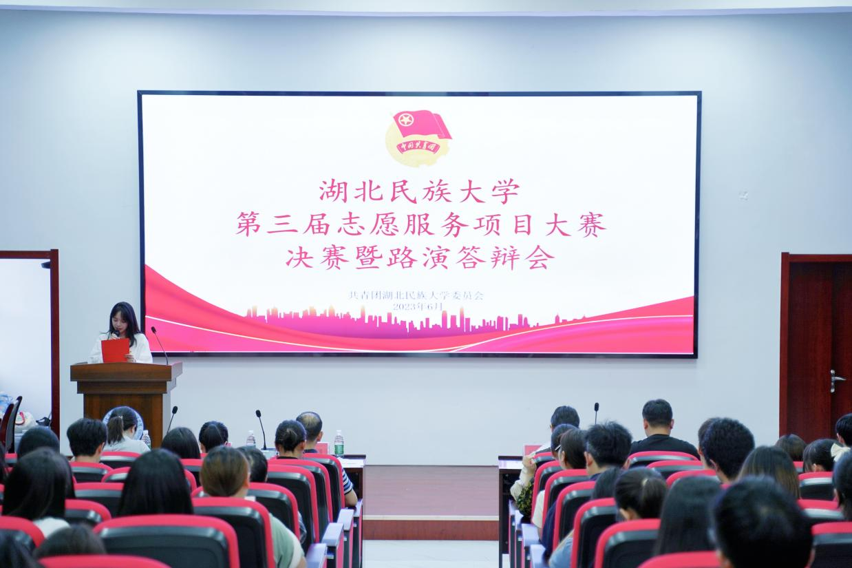 6月6日晚,我校第三届志愿服务项目大赛决赛暨路演答辩会于外国语学院报告厅举行。恩施市义工协会会长向波,音乐舞蹈学院党总支副书记、恩施州青年志愿者协会会长邓丽,党委宣传部精神文明建设科科长胡鑫,学生工作处学生思想教育及管理科科长田甜,校团委社会实践与志愿服务部副主任雷鹏受邀出席并担任评委。