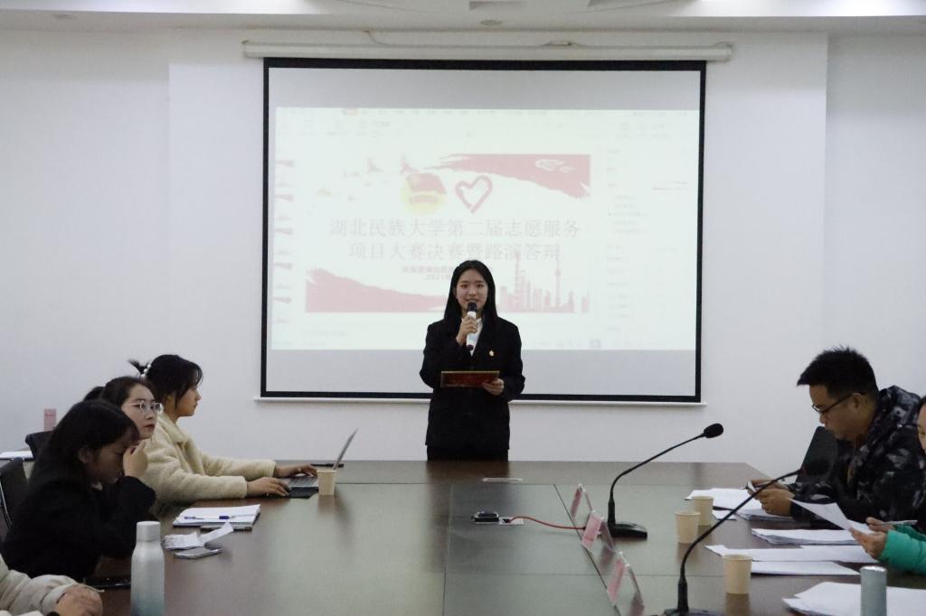 本网讯(记者 冉婵娟/文 见习记者 赵光荣/文 严海燕/文 张敏/文 见习记者 牟婷婷/图)为推动我校在新时代新形势下的志愿服务工作项目化,制度化,常态化发展。12月5日,我校团委特于公寓办二楼会议室开展以“庆建党百年 谱志愿新篇”为主题的第二届志愿服务项目大赛决赛。恩施州五彩社会工作服务中心理事长吴欣,生物科学与技术学院学生科科长彭璟,校团委办公室主任彭弥,信息工程学院团总支书记唐昊受邀出席并担任评委。