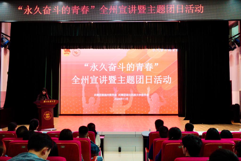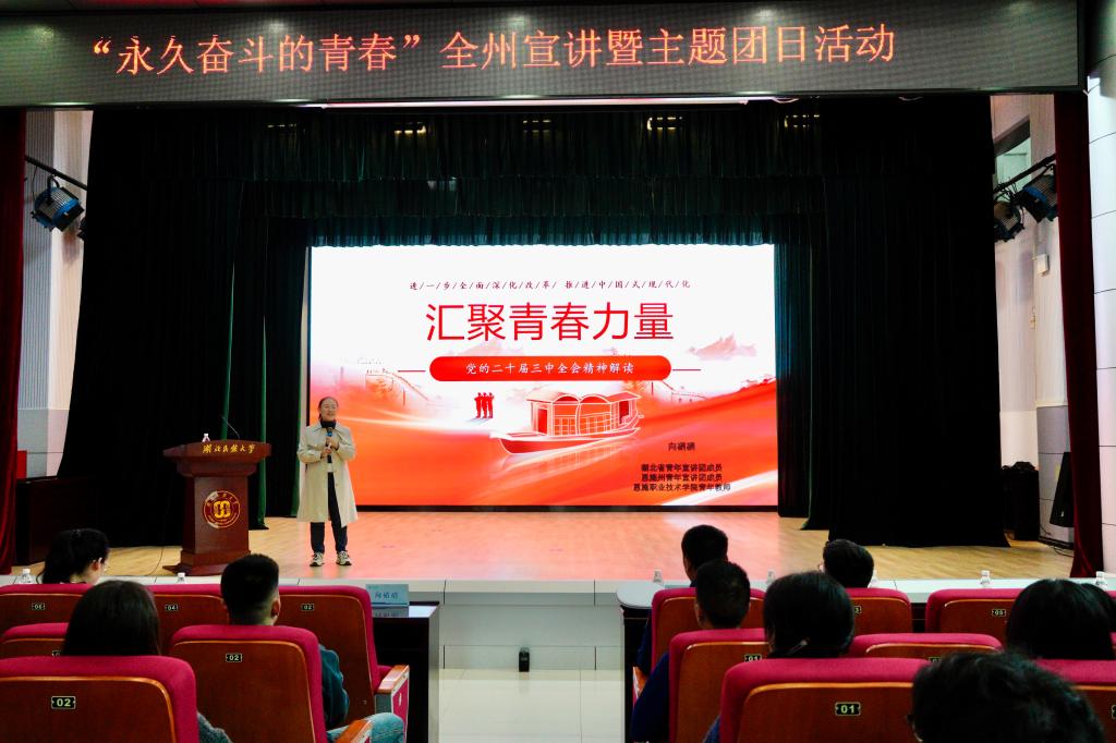 11月14日下午,由共青团恩施州委联合我校共同举办的“永久奋斗的青春”全州宣讲暨主题团日活动在行政楼1号会议室顺利举行。湖北省青年宣讲团成员向硝硝,湖北向上向善好青年、恩施州青年宣讲“00后”宣讲员姜志容,湖北省青年岗位能手、国网恩施供电公司建始县红岩供电所副所长钟杨兴宇,恩施州消防救援支队金桂大道特勤站副站长蒋盟,第十一届中国青年创青春大赛(科技创新专项)金奖获得者王培尧应邀出席,恩施州直、市直单位以及三所高校的团员青年代表共计200余人参与了本次活动。