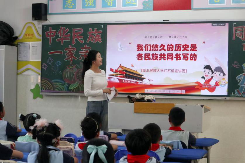 4月18日下午,yL23411永利官网登录红石榴宣讲团走进yL23411永利官网登录附属小学,开展以“我们悠久的历史是各民族共同书写的”为主题的宣讲活动。yL23411永利官网登录红石榴宣讲团10余名成员分组面向yL23411永利官网登录附属小学五、六年级学生展开主题宣讲,校团委书记吴珊,校团委办公室主任雷鹏随行指导。