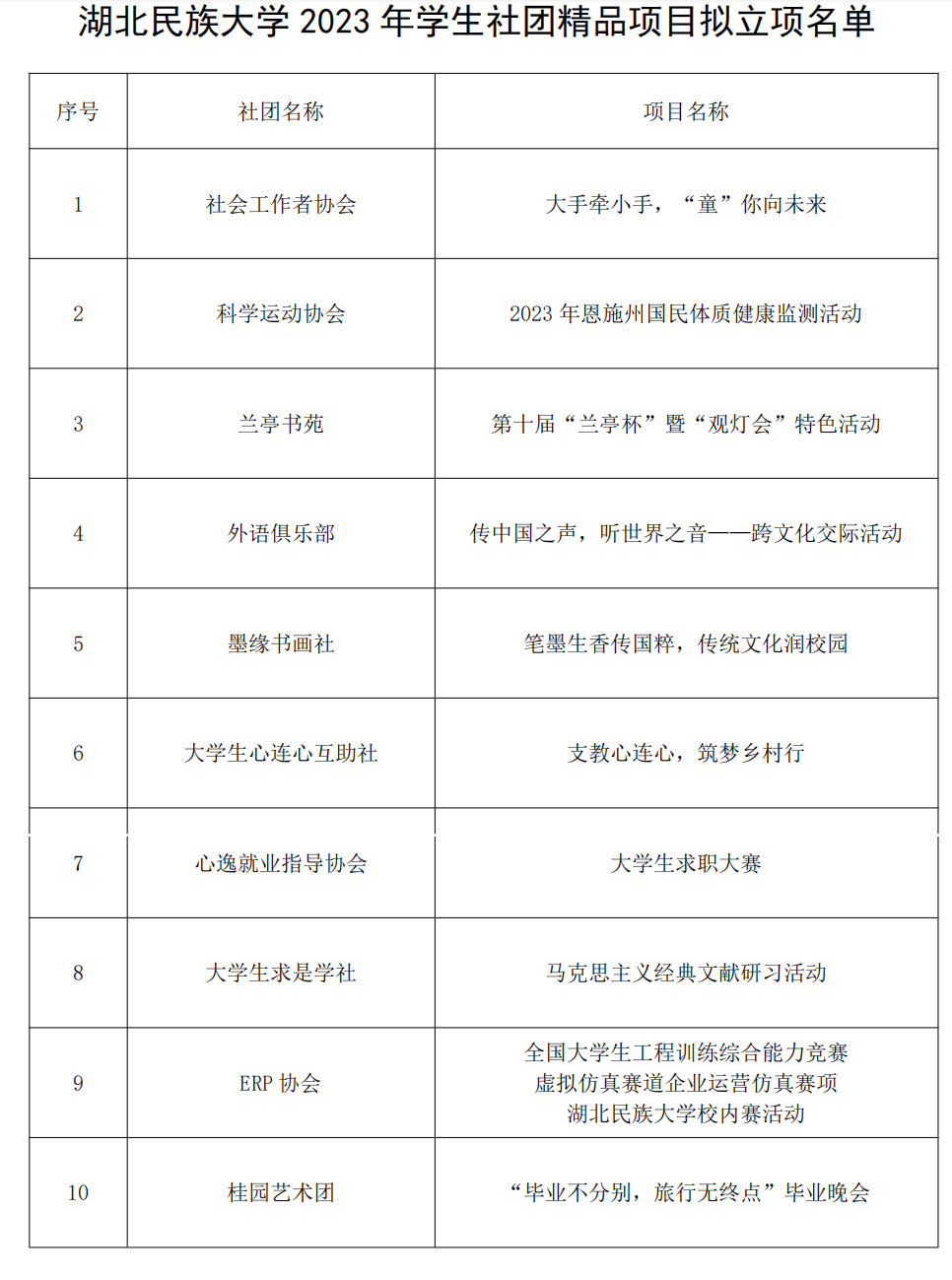 根据《关于申报yL23411永利官网登录 2023 年学生社团精品项目的通知》要求,经社团申报、学院审核,校团委组织评审,最终确定社会工作者协会“大手牵小手,“童”你向未来”等 10 个社团项目为学生社团精品项目。现将拟立项名单予以公示,公示时间为 2023 年 4 月 4 日至 4 月 11 日。如对公示结果有异议,请在公示期内以实名附书面形式向校团委反映。