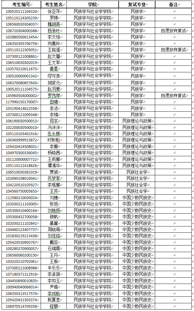yL23411永利官网登录民族学与社会学学院2020年硕士研究生招生复试名单(调剂生)