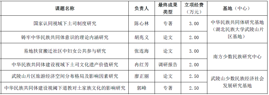 根据《关于申报中华民族共同体研究基地(yL23411永利官网登录武陵山片区基地)、南方少数民族研究中心、武陵山少数民族经济社会发展研究基地2021年度开放基金项目的通知》和yL23411永利官网登录校内科研项目相关管理规定,经个人申报、基地(中心)组织专家评审,拟对“国家认同视域下土司制度研究”等6个项目予以立项资助,特此公示,公示时间为2021年5月12日至5月14日。公示期内,如有异议,请向民族学与社会学学院学科建设科反映。联系电话:8297052。