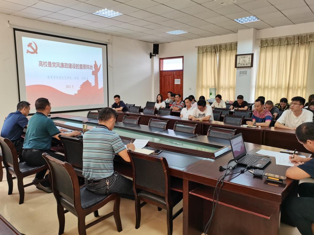(通讯员 张弋明)9月23日,体育学院在二楼会议室举行了体育学院2021年党风廉政建设宣教月系列活动之“书记讲廉政党课”活动,体育学院全体党员干部参加。活动由党总支副书记何斌主持。