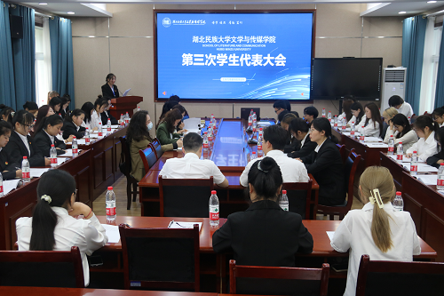 本网讯(记者 王玉然 王燕红)4月22日,我院在文传楼智慧教室(一)召开第三次学生代表大会。院党委副书记李御娇,团总支书记穆小雪,学生科老师王修皓、谭芸及各学生代表参会。开幕式上,全体奏唱国歌。穆小雪代表学院团总支致贺词。会议现场(记者 张熠璠/摄)校学生会主席华雨萱发言。她就“坚持...