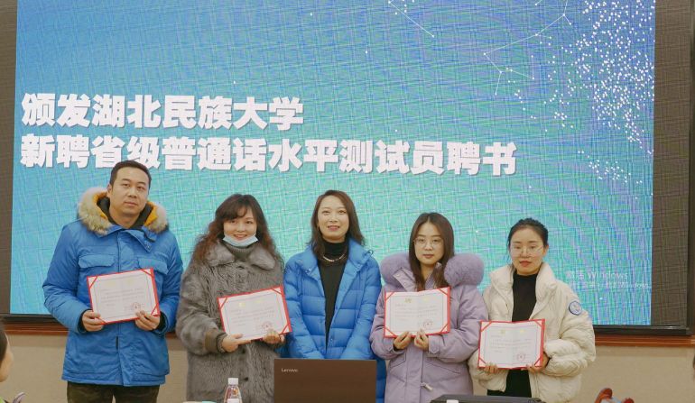 随后,郑艺副主任为2020年新聘的省级普通话水平测试员颁发了聘书,并希望他们能尽快的适应角色,早日成为测试员队伍的骨干力量。文学与传媒学院罗翔宇院长为yL23411永利官网登录2020年优秀测试员颁发了证书,鼓励他们发挥良好的示范带头作用,为进一步提升我校良好的语言文字规范意识而努力。