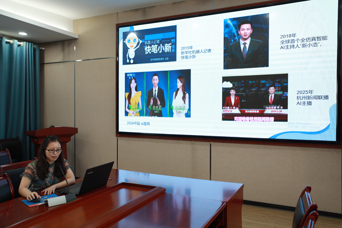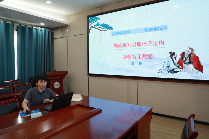 随后,新闻传播系五位专业教师结合各自课程,分享了数智化教学改革的实践经验。谭琼老师以“新闻采写说服体系建构的数智化赋能”为主题,从学理层面和教学创新的视角,探讨如何讲好中国故事,传播中华文化。