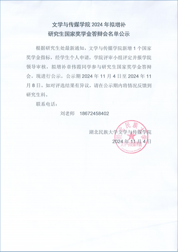 文学与传媒学院2024年拟增补研究生国家奖学金答辩会名单公示