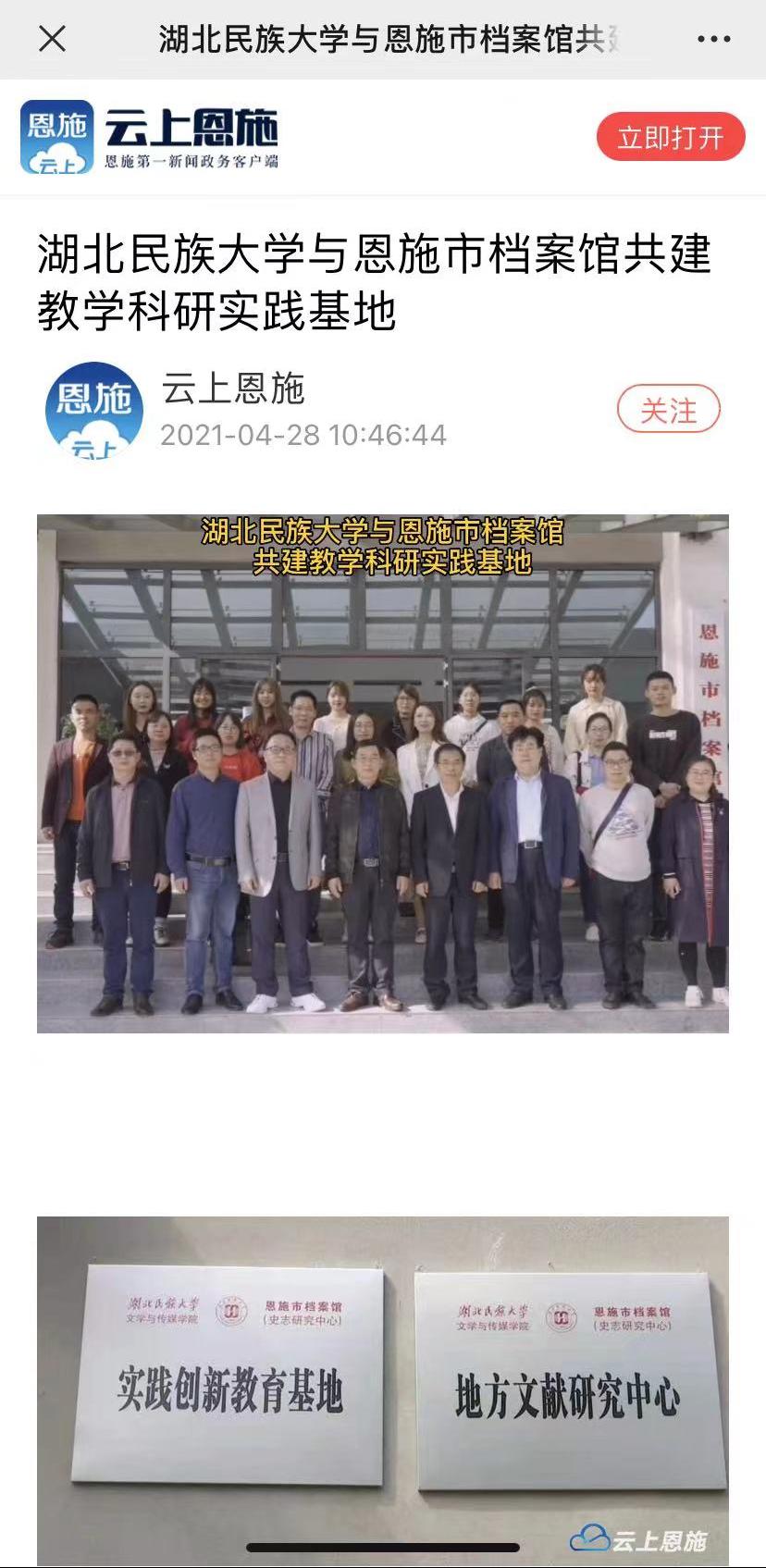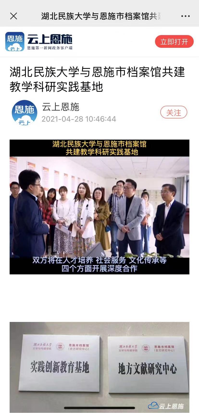本网讯(记者 杨荣)4月27日下午,我院与恩施档案馆(史志研究中心)共建的教学实践基地与地方文献研究中心在恩施市档案馆举行签约挂牌仪式。云上恩施对此次活动进行报道,恩施市市委办公室常务副主任马开友、恩施市档案馆馆长汪盛松及领导班子成员与我院党委书记杨光宗、院长罗翔宇、副院长何荣誉、校语委常务副主任郑艺等领导及研究30余人出席此次签约暨揭牌仪式。据了解,本次签约挂牌旨在落实应用型人才培养目标,发挥各自优势,实现资源共享,按照平等自愿、互惠双赢、相互促进、共同发展的原则,在档案信息化、资源开发、人才建设、档案史志编研与文化传播、宣传展览等方面相互合作、取长补短,推进校地合作向更高层次发展,更好地服务于经济社会发展。