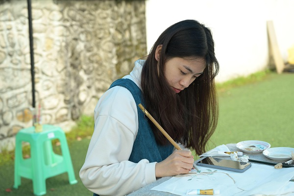 比赛区内,涵盖毛笔字、绘画等多种形式,充分考验参与者的临场发挥能力。“软笔区”参赛者端坐于书桌前,笔法或清秀隽永,或遒劲有力,一撇一捺尽展高超的书法技巧;“绘画区”参赛者将各色各样的颜料尽情挥洒,创作出精致的风景画,吸引众多学生驻足观看。