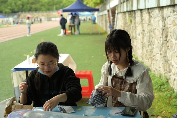 活动分为茶艺表演和游戏环节两部分。茶艺表演环节,表演者身着汉服,静心凝气,洗盏、盛水、倒茶,过程行云流水、一气呵成,优雅的洗茶具技术和精湛的茶艺表演引得观众连连称赞;游戏环节分为“DIY香包”“猜茶谜”“贴心愿贴”三个部分,完成游戏即可参与集章抽奖活动。“DIY香包”环节要求参与者充分发挥想象力,用精美的布料和香料制作专属香包;“猜茶谜”环节,参与者时而冥思苦想,时而对答如流,在充分考验基础茶艺知识的同时也激发学生对茶文化的兴趣;“贴心愿贴”环节,参与者在色彩绚丽的心愿纸上写下心愿贴在棚中,真切传达出自身对未来的美好希冀与展望。