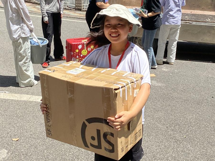活动当日,随着搬迁工作启动,搬运组志愿者两两协作,用手推车往返运输行李;引导组在楼道及路线关键点维持秩序,为搬迁同学指明方向;后勤组则在新寝室楼前设立临时服务点,清点登记行李并为同学提供咨询帮助。志愿服务过程中,我院为志愿者准备的防暑药品与简餐,也让服务过程更有温度。志愿者以文明礼貌的态度和高效务实的行动,确保搬迁路线的持续畅通,也为百余件行李提供妥善保管。