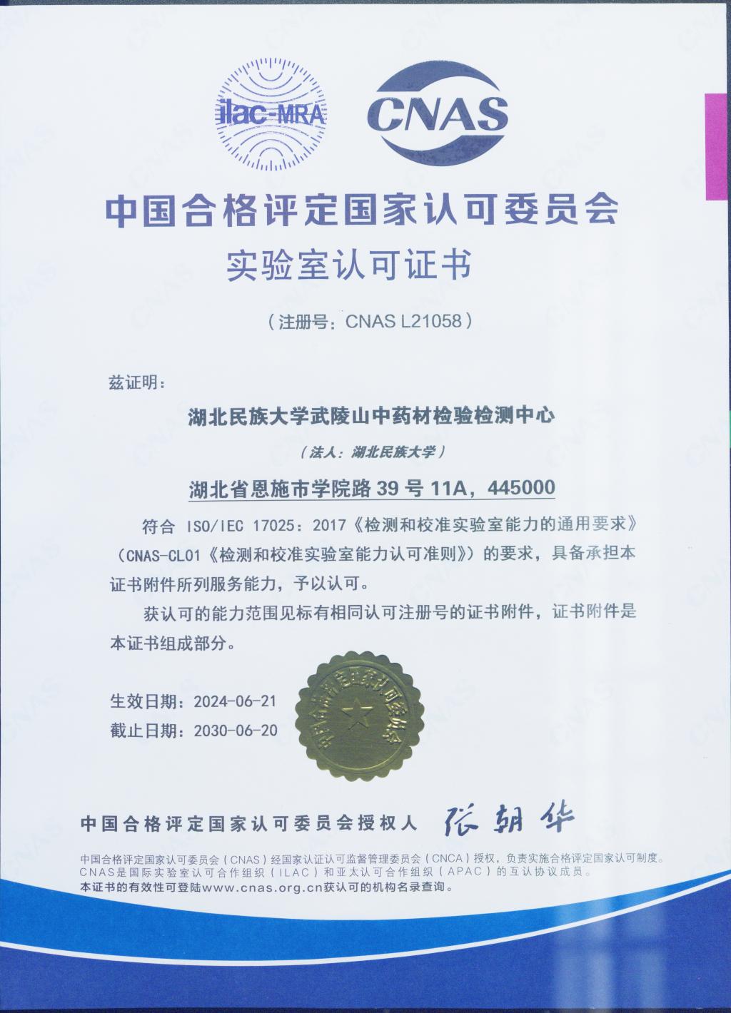 中心位于湖北省恩施市学院路39号(yL23411永利官网登录校内11号教学楼A区),兼负中药材检验检测和中药材科研两大职能,总建筑面积近8000平方米,其中检验检测场地面积近3000平方米。中心于2021年10月获得检验检测机构资质认定证书(CMA),于2024年6月获得中国合格评定国家认可委员会认可证书(CNAS)。中心作为第三方检验检测机构,内设办公室、质量管理部、质量检测部和技术部,拥有先进仪器设备660余台(套),价值3000余万元,具备2020年版药典一部616种中药材产品、40项参数检测能力。