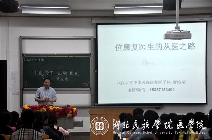 讲座分为“一位医生的从医之路”和“武汉大学中南医院住院医师规范化培训”两个环节。在第一环节中,廖教授就“选择医学”、“选择康复医学”、“团队成就”、“结束语”四个方面展开讲座。廖教授表示,阳光自信是作为一名医生的首要品质。接着,廖教授从对象、目的、治疗手段、后果等方面阐述临床医学和康复医学的关系。他指出,临床医学以疾病为主导,而康复治疗是以功能障碍为主导。此外,廖教授还列举了他在读研期间做的一些事情,如积极参加各类学术活动、打好英文基础、完成研究课题、临床训练等,以此来激励同学们规划好自己的大学生活。在讲“团队成就”时,廖教授从团队带头人、学术任职、导师队伍等六个方面介绍了他的团队。廖教授的讲座风趣幽默,他在轻松的氛围下向我们展示了优秀学长学姐们的杰出成就,并强调康复医学和早期康复工作的重要性。在第二环节中,廖教授向同学们介绍武汉大学中南医院住院医师规范化培训的报名条件、方式、考试面试、待遇等相关信息。