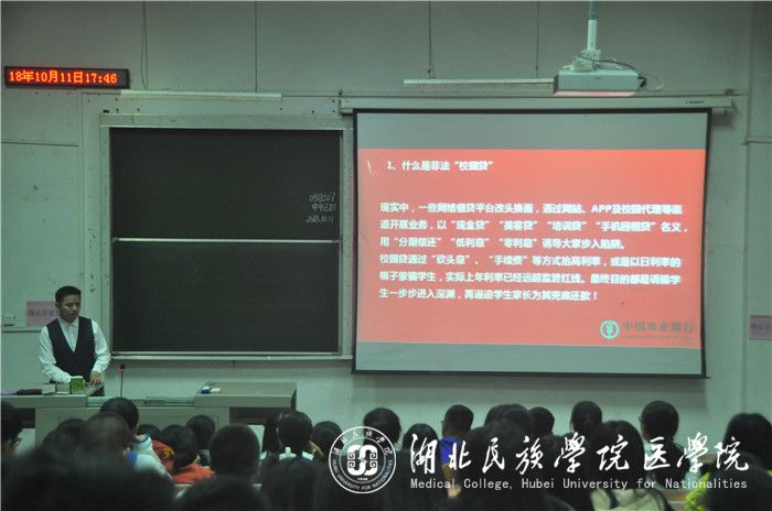 本网讯(记者 向锦月 欧金兵/文 吕丰旭/摄)为抵制非法校园贷,加强学生防范意识,10月11日,我院团总支组织纪检部于医学院8206教室开展了非法校园贷知识宣传讲座。我校18级199名学生聆听本次讲座,农行恩施支行金融部专员谭志辉应邀担任主讲人。