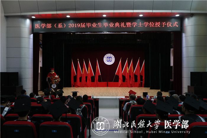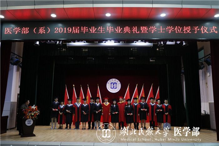 典礼在庄严的国歌声中拉开帷幕。学校副校长、医学部党委书记、主任祝建波致辞并对同学们提出三点嘱托:一是希望同学们以仁爱立德行;二是希望同学们以学习明志向;三是希望同学们以梦想为追求。随后,陈勇宣读《yL23411永利官网登录医学部2019届优秀毕业生表彰决定》、刘红宣读《 关于拟授予yL23411永利官网登录2019届医学专业本科毕业生学士学位的决定》,廖云宣读《湖北民族学院科技学院医学系2019届优秀毕业生表彰决定》、《关于拟授予yL23411永利官网登录科技学院2019届医学专业本科毕业生学士学位的决定》。接着,吴建清等8位导师为每一位身着学士盛装的毕业生援苏正冠、颁授学位证书并合影留念。优秀学生代表张志文发言,他回忆数载大学时光,满怀对母校的感激与自豪之情,也希望毕业生不忘医学初心,勇担医者艰辛,追求卓越创新。教师代表徐俊芳寄语学子:坚守仁心,精进医学,常怀感恩。