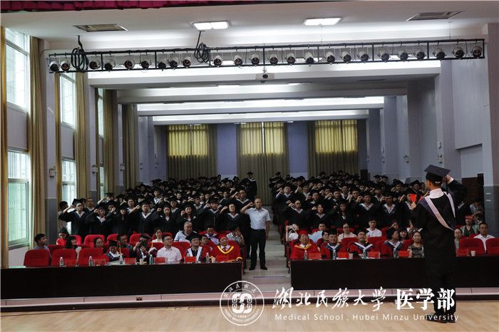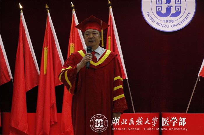 最后,学校党委书记、医学部解剖学教授吴建清饱含深情的给同学们上了“最后一堂课”,并通过提问抢答的方式为同学们赠送自己亲自主编的教材,同学们与老师积极互动,现场氛围活跃。吴书记结合优秀校友的学医之路勉励同学们:英雄不问出路,在民大的学习生活是同学们人生中最值得记忆的美好时光;同学们要不忘医者初心,牢记医者使命,博学博爱,成医行医,共筑中华民族伟大复兴的健康中国梦; 并亲切嘱咐同学们:人生的道路不会平坦,同学们要保持良好的心态,善待他人、善待自己;最后,他寄语同学们:“雄关漫道真如铁,而今迈步从头越”,医学生要弘扬长征精神、创新精神和担当精神,不负时代赋予的使命。伴着铿锵有力的宣誓声和校歌声,yL23411永利官网登录医学部、yL23411永利官网登录科技学院医学系2019届毕业生毕业典礼暨学士学位授予仪式圆满落幕。